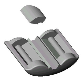 | My interest in Tension Fabric structures led to me think about new ways to create a structural system for fabric roofs for my Cad/Cam final project. An interest in the mechanics of the vertebrae structure of animals encouraged the development a segmented structural system, which offers an infinite possibility of curvatures. After a visit to Birdair in Buffalo, New York, I discovered that the joining of fabric panels was a major cost of the fabrication of PTFE coated fiberglass fabric roof systems. I began to think of fabric clamping methods that would eliminate the need for heat welded seams. Using Solidworks, I modeled the structural fabric clamp, which then was saved as a .STL file which was used to print out a wax model on the Thermojet 3D printer. Chris Kane Casting Studio in Pawtucket, RI, then used my wax parts to create aluminum parts using a lost wax casting method. Originally, I wanted to have a one-piece main body to which a cam would be inserted in one end, but after discussing the limitations of the gravity casting process with Chris Kane, I opted for a two-part main body with two captured cams. The Fabric Clamp uses a logarithmic spiral cam with a 12.5 degree cam angle(using the equation: radius=e to the sine theta times the sine of the camming angle). The cam grabs the fabric once it is inserted based on the coefficient of friction between the cam and the fabric. I found the friction coefficient was not adequate between the aluminum and the PTFE coated fiberglass, so I glued sandpaper on the cam which worked fine. I choose the logarithmic cam as the force of clamping of the fabric is proportional to the fabric tension, thus moderating the maximum tension on the fabric. In addition, it offers a system where the fabric is secured over a surface and is not subjected to point loads or severe bends. Pairs of the fabric clamp will be connected with a ring to offer stability and to retain the desired angle between sections. Overall curvature is created by the variance of how the rings are fixed into each pair. |